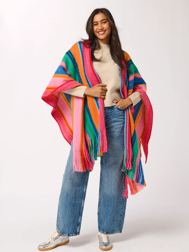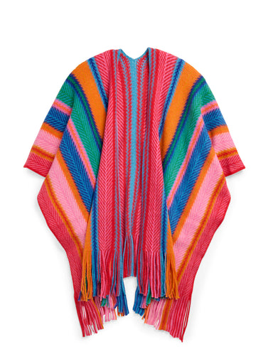 Meet the Nicola Cape – your new go-to for adding bold personality to chilly days. With its vibrant, chevron-inspired stripes and playful fringe tri...