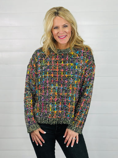 One of the cutest tweed sweaters ever! A multicolored tweed sweater with shining silver tinsel woven into the fabric for the right amount of shine...