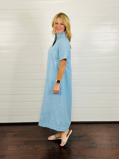 Classic and coastal, the Nantucket Dress is an effortless staple for the season. This blue-on-blue striped long dress features a chic mock high nec...