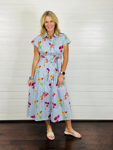 The Garden Party Dress is a fresh, feminine must-have for Spring. This midi dress features classic blue and white stripes accented with colorful ...