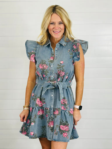 Meet the Georgia Denim Dress—a fresh, feminine twist on classic denim. This light-wash denim beauty features a sweet pink floral print, pea...