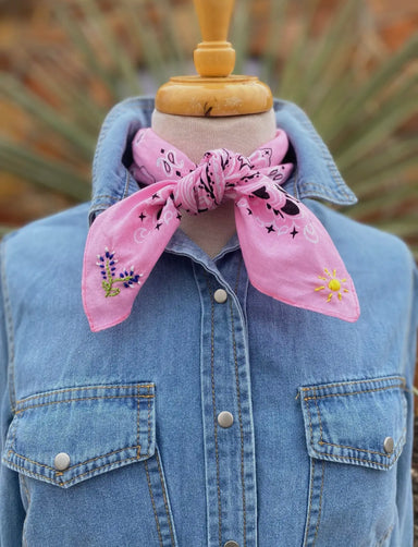 Fun colors for the luck of the cowgirl. It’s all in the details. Each bandana is hand embroidered with love just for you. No two will be exactly th...