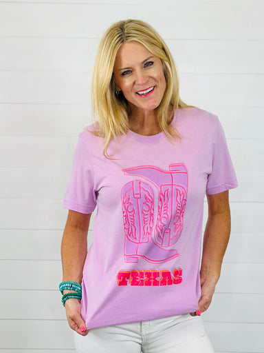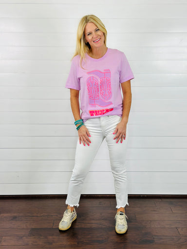 This lilac tee is rodeo-ready with a sweet western twist. Featuring a cute pink boot graphic, this tee adds the perfect pop of color and charm to y...